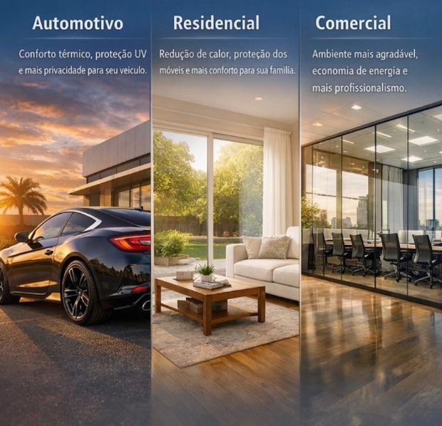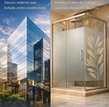 Oferecemos soluções completas como películas de controle solar, que ajudam a reduzir o calor e o consumo de energia, películas de segurança, que aumentam a resistência dos vidros contra impactos, além de películas espelhadas e decorativas, ideais para quem busca mais privacidade e estética moderna.